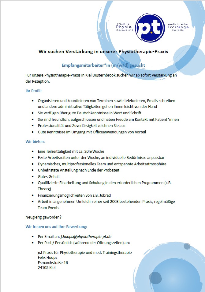 Seit 2003 führen wir in zentraler Lage Kiels, an der Schnittstelle zwischen Blücherplatz und Düsternbrook, die Praxis p.t.